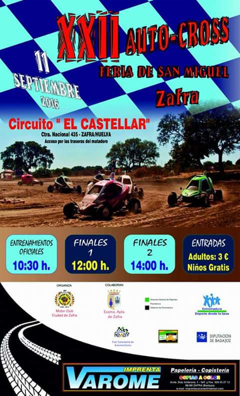 Un total de doce vehículos han participado esta mañana en el XXII Autocross Feria de San Miguel de Zafra disputado sobre el circuito de El Castellar del citado municipio. En la Agrupación A1 la victoria se la apuntó Jonathan Vázquez Morán de Ráfagas Racing con su Citröen Saxo 16V VTS con un tiempo de 15:07,52 minutos en la superfinal en la que los participantes dieron 16 vueltas a un trazado que contaba con una longitud de 1100 metros y 12 metros de ancho. En la Agrupación A2 la victoria se la adjudicó el único participante, Vicente Gascón Betegón con su Opel Astra GSI del Motor Club Ciudad de Zafra. En la Agrupación B, la victoria se la apuntó también Juan Luis Garzón Pérez con su Subaru Impreza STI, mientras que en la disciplina más concurrida, en Car Cross, la victoria fue para Esteban Ortiz del Motor Club Ciudad de Zafra con su Casmat Hell Racer y un tiempo en la superfinal de 12:48,87 minutos en dar las 16 vueltas al circuito por delante de Fredi López Vicente de Escudería Cerro Negro con su habitual Yacar Cross a casi trece segundos de la cabeza.