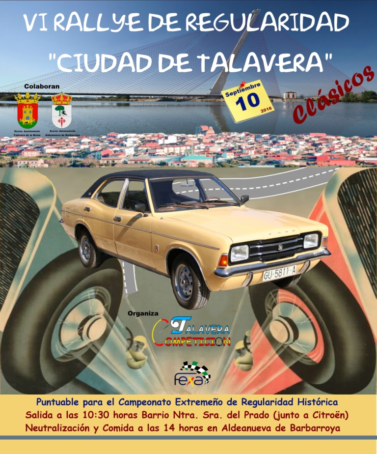 El próximo sábado 10 de septiembre, la localidad de Talavera de la Reina acogerá la celebración del VI Rally de Regularidad de Clásicos Ciudad de Talavera, valedera para el regional extremeño de una especialidad destinada a vehículos de más de 25 años de antigüedad y cuya clasificación final se establece en función de la media impuesta y las penalizaciones acumuladas. La salida será a las 10 horas desde el Barrio Nuestra Señora del Prado. La neutralización y la comida serán a las 14 horas en Aldeanueva de Barbarroya.