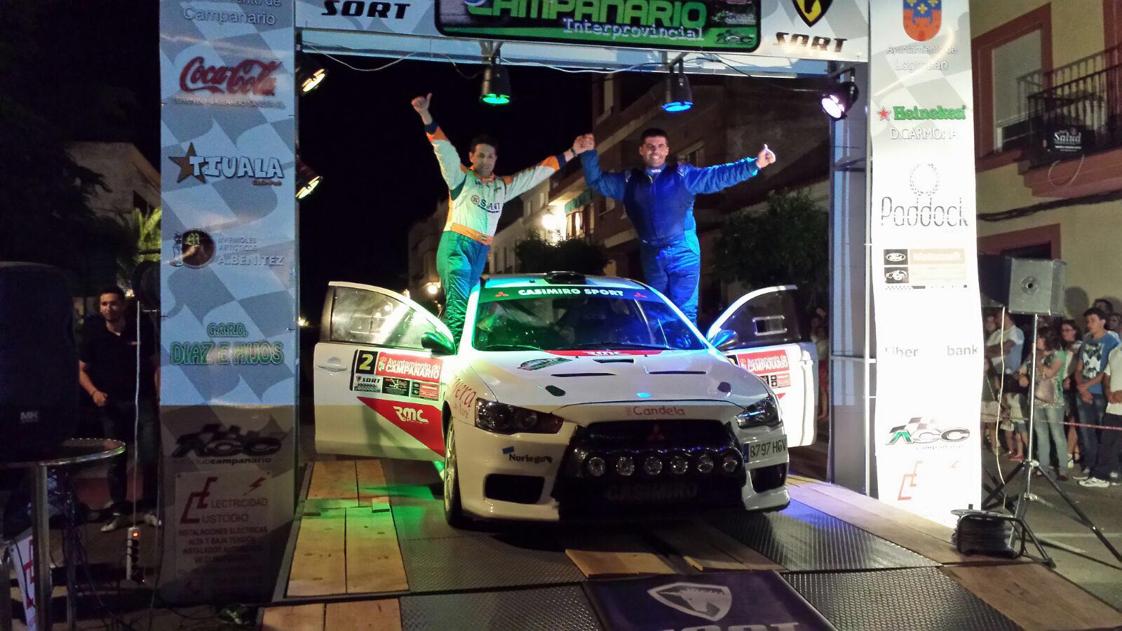Los componentes de la Escudería Ráfagas Racing, Antonio Luis Casimiro y su copiloto Joaquín Ortíz se han alzado esta noche con la victoria en el V Rallye de Campanario Interprovincial, tercera cita puntuable para el regional de asfalto de Extremadura, así como para los Campeonatos de Madrid y de Castilla-La Mancha. Los vencedores que han marcado los mejores tiempos en ocho de los nueve tramos cronometrados de la carrera han marcado un tiempo global 51:36,026 minutos a los mandos de su Mitsubishi Evo X R4. En segunda posición ha concluido la dupla andaluza conformada José Antonio Caballero y Víctor Barba de Co 2013 Sport con su Mitsubishi Lancer Evo X a más de dos minutos y veinte de la cabeza, mientras que la tercera plaza se la adjudicaron Enrique Salamanca y José María Prieto de Escudería Faro de Extremadura quiénes con un Renault Clio Williams acabaron con un tiempo de 54:51,099 minutos, en una competida carrera donde únicamente han abandonado 5 vehículos.