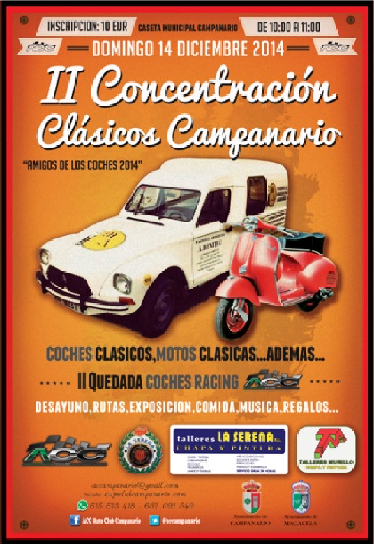 Automóvil Club Campanario (ACC) vuelve a reunir el próximo 14 de Diciembre la II Concentración de Coches Clásicos, evento que cierra la temporada de ACC, junto con la II concentración de Vehículos deportivos Racing. Este año, como novedad, incluimos la Concentración de Motos Clásicas.