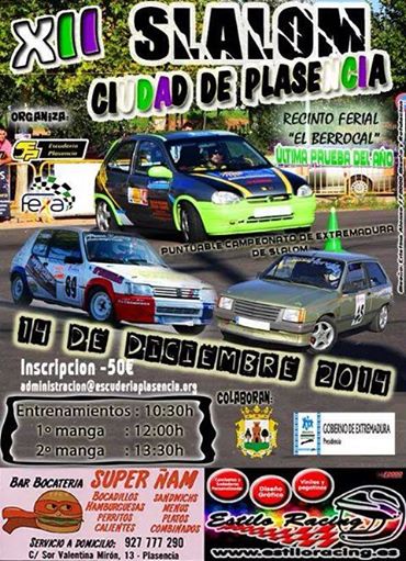 Este domingo 14 de diciembre se dsiputa el XII Slalom Ciudad de Plasencia, ultima prueba del año ya que el Criterium de Feria fue suspendido, organizado por la Escuderia Plasencia discurrira en el Recinto Ferial El Berrocal y promete ser una prueba con mucho espectaculo. Horarios: entrenamientos: 10:30 h – 1º Manga: 12 h – 2º Manga: 13:30 h. Inscripciones 50€ .