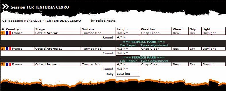 A partir de ahí serán tres las especiales sobre las que se disputará la prueba : TRAMO A Sorica de 15 kms. , TRAMO B Peyregrosse-Mandagout de 12,8 kms. y TRAMO C Akagi II de 3,4 kms., a realizar dos pasadas sobre cada uno de ellos . El rallye se divide en TRES SECCIONES de dos tramos cronometrados cada una , con un parque de asistencia a la finalización de cada una de ellas . Es decir , A1 – B1 – service park – C1 – A2 – service park – B2 – C2 – fin del rallye . Recordad que los daños son acumulativos y solo se repararán en los service parks